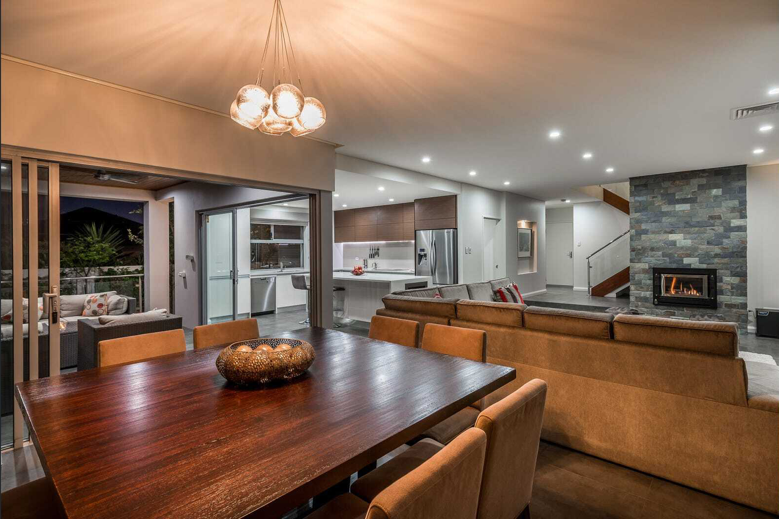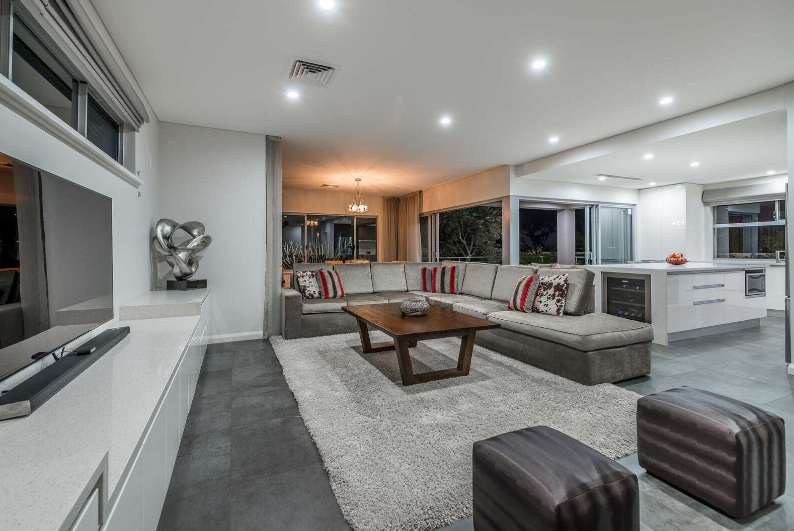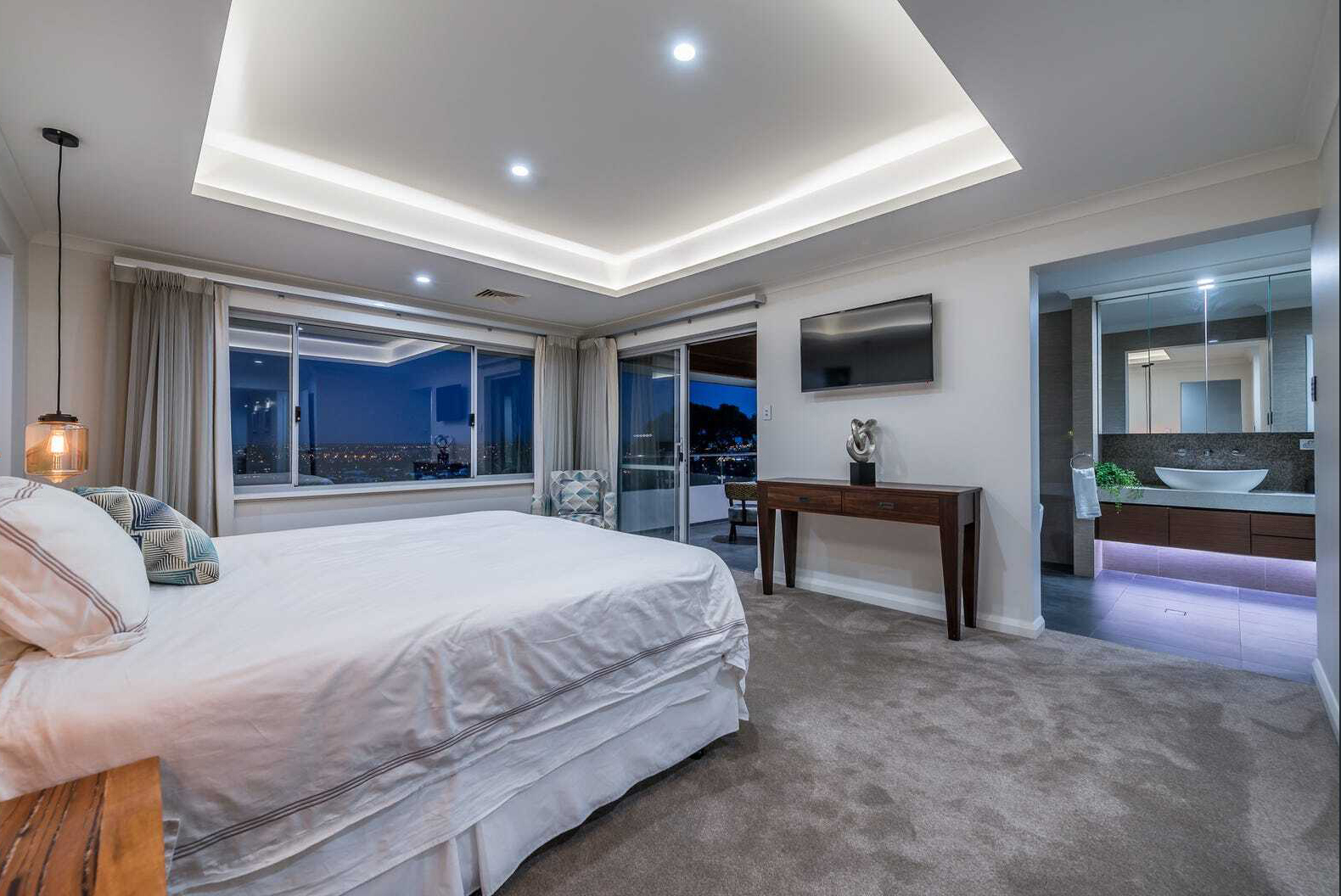 The living areas are finished with elegant natural stone and luxe textures, and the sophisticated lighting elements add to the ambience. Open the stacker doors to the alfresco to create an extensive entertaining area where you can relax with your guests all night long. The distant lights shine as the backdrop to every wonderful evening. The open plan kitchen has been intelligently designed so you can admire the view whilst enjoying streamlined culinary bliss. It’s beautiful, yet practical with breakfast bar and overhead cabinetry.